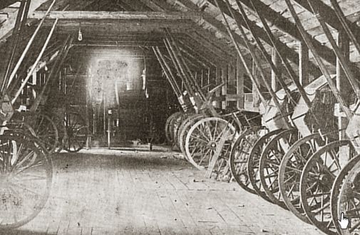 Kurikan ajokalutehtaan varasto, jossa ajokalut rivissä vuonna 1920. |