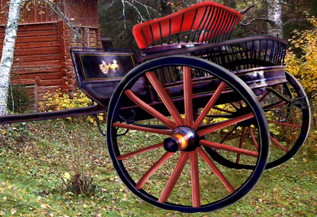 Noppalainen pussikärry oli siro, poikamiesten suosima kahdenhengen kärry, jonka istuimen takana on tila hevosen heinäsäkkiä tmv. varten. Entisöity 1993 M.Lahti.