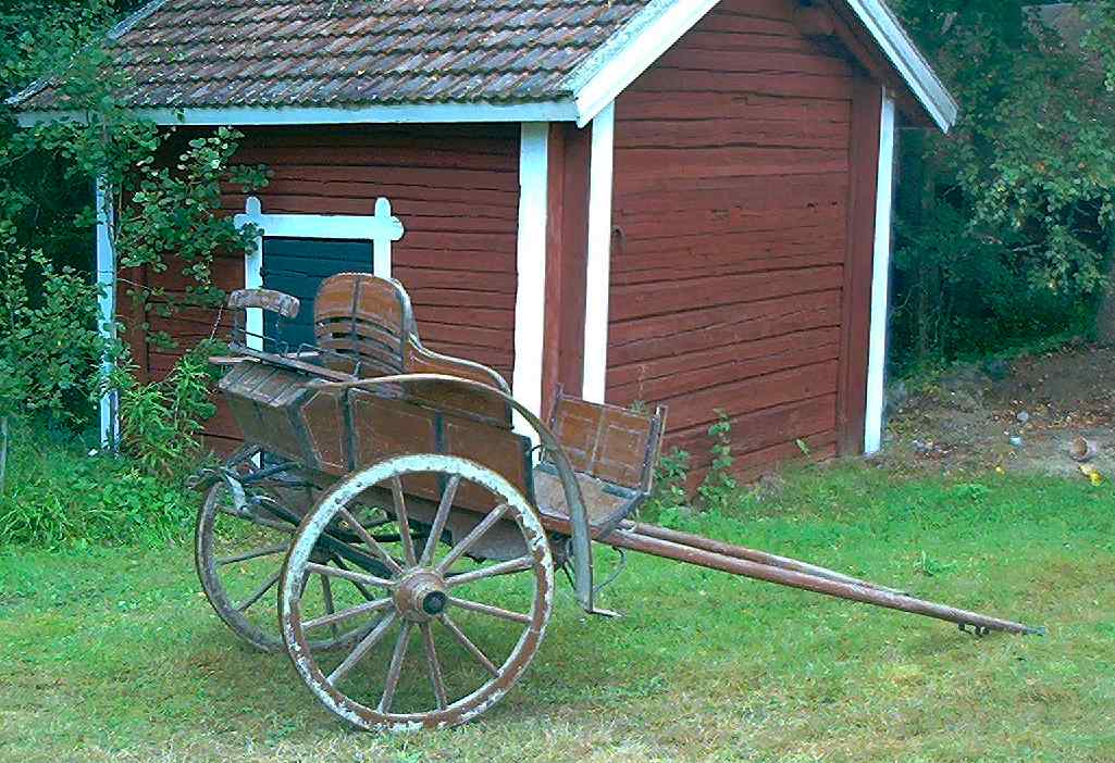Frigårdin sepän raudoittama valkjärveläinen 1920 luvulla. Malli on Itä-Suomesta Valkjärveltä ja sen myötä ajokaluteollisuus päättyi 1955. Taustalla Riemun ensimmäinen navetta.