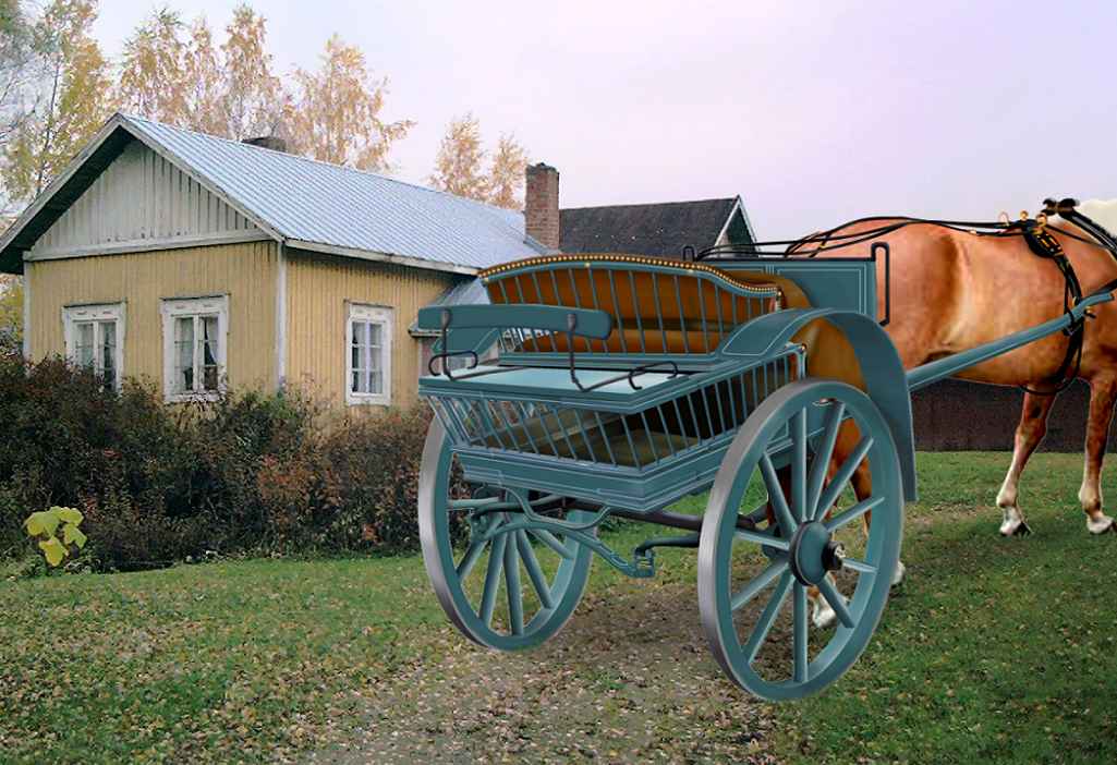 | Vinopuikkoonen kärrymalli oli noppalaisten oma kärrymalli ja muunnos turunmallista. Sen takana oli ulos käännettävä lisäistuin. Taustalla Hermanni Teemun tupa. | |